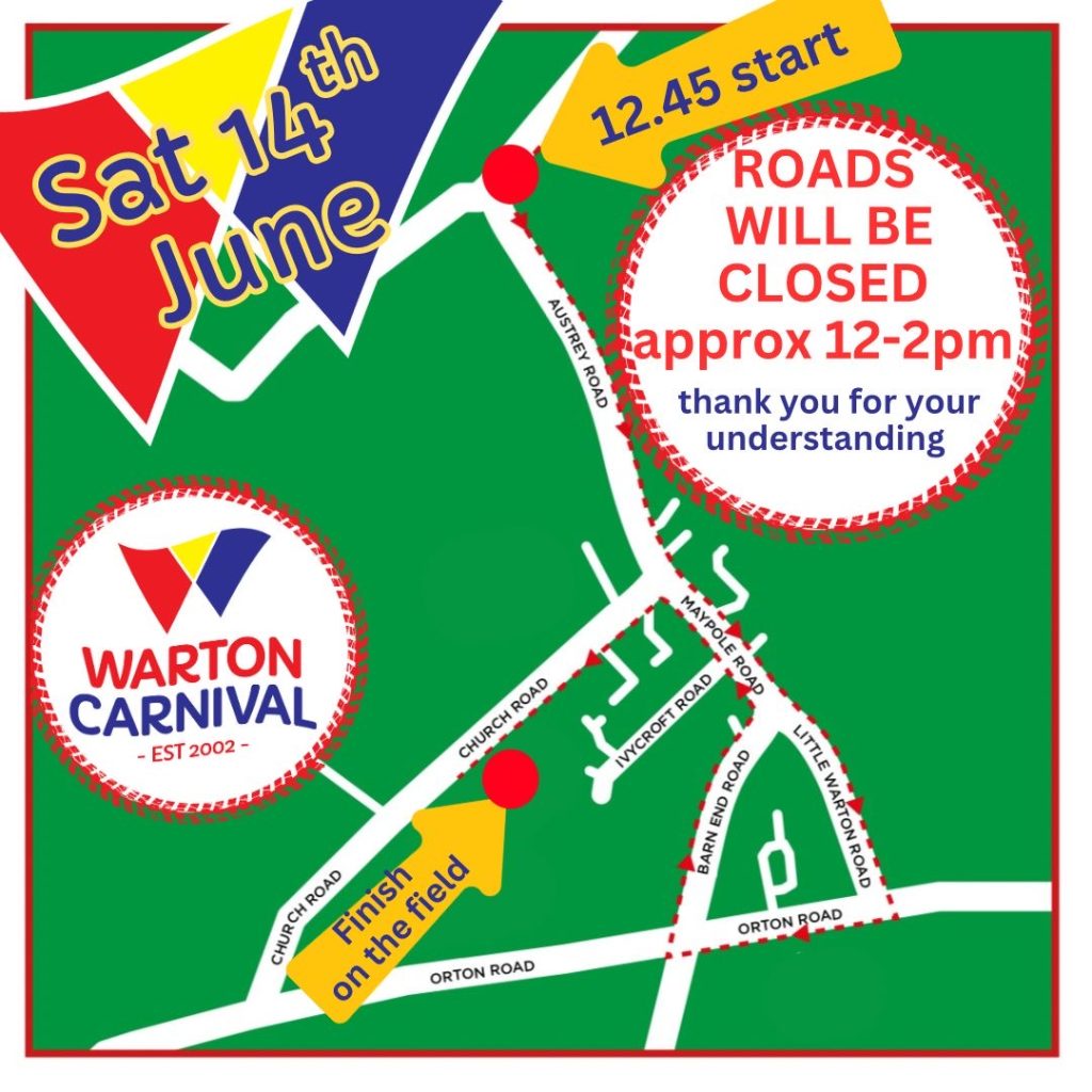 During the road closure there will be no access through Warton in any direction so please plan ahead and take an alternate route. If you are travelling from Austrey to Warton you are welcome to follow the procession but please do not pass our procession car![]()